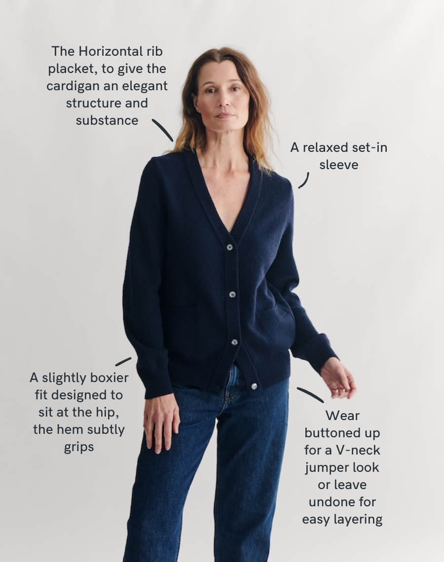 Out of stock sizes will be back in January. The original cardigan - a perennial bestseller and still the benchmark. Relaxed yet polished, classic yet modern - it works buttoned up or left undone, with whatever your style. Inspired by the cardigan worn daily by our founder Rachel’s grandfather, it’s old school made new, with a simplicity that always feels right. Knitted in the British Isles from 100% traceable Scottish-spun lambswool and finished with our signature horizontal placket and sustainably sourced Mother of Pearl buttons. A modern icon - the cardigan, done properly.