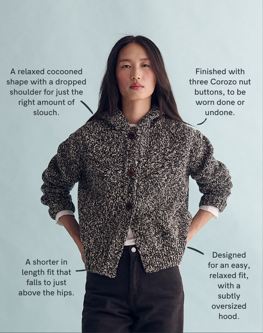 A shorter-in-length hooded relaxed-fit Cardigan finished with three buttons. Designed for a subtly-oversized fit.