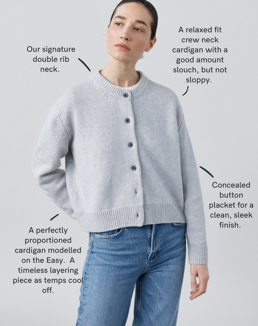 A boxier with a slightly wider, shorter fit cardigan. Falls to just above the hips and gently drapes. Finished with our signature double folded crew neck. The cardigan companion to our best-selling EASY.