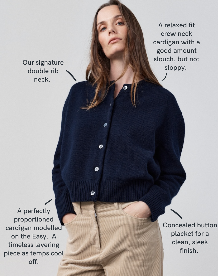 A boxier with a slightly wider, shorter fit cardigan. Falls to just above the hips and gently drapes. Finished with our signature double folded crew neck. The cardigan companion to our best-selling EASY.