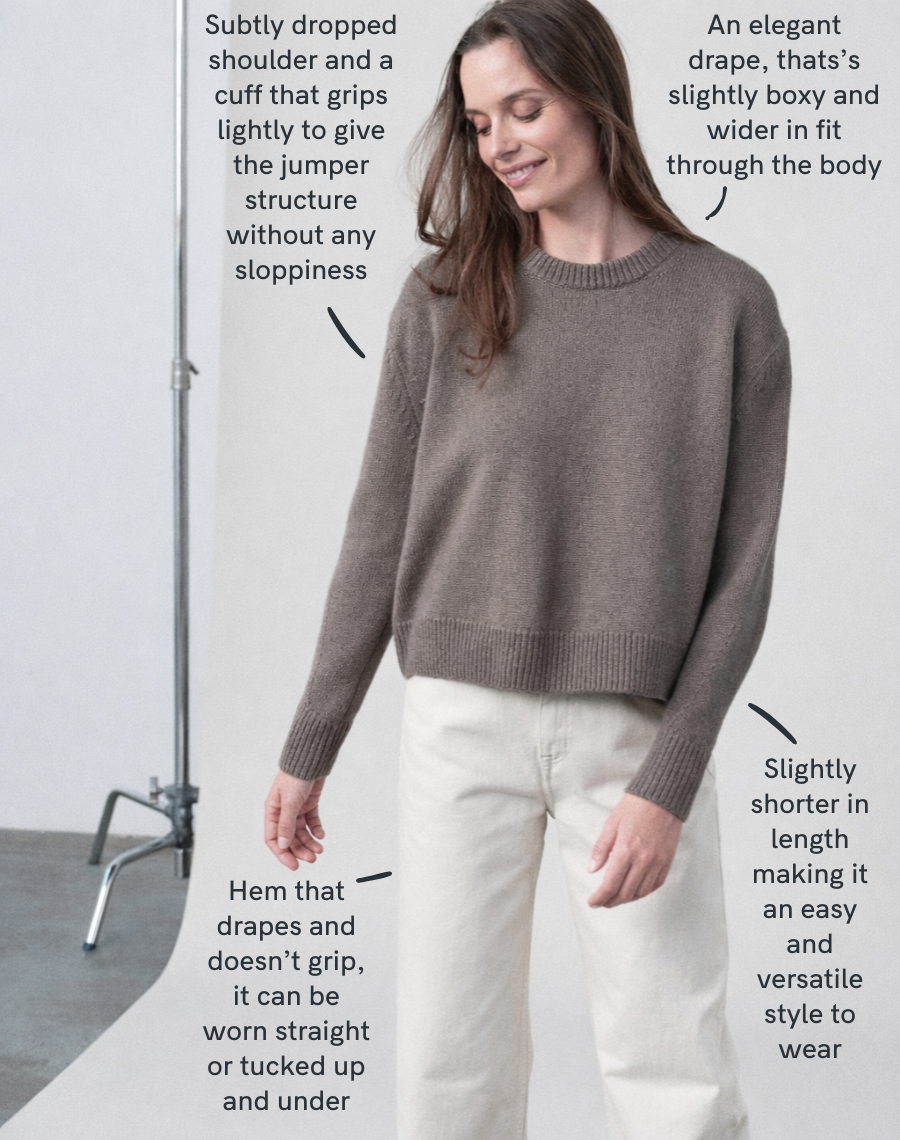 This is our softest wool. It's a sweet spot of real softness with substance. Warming yet light as this knit is in a mid-weight gauge. It's the purity of the Scottish water used throughout the spinning process that makes this wool feel so smooth and soft.