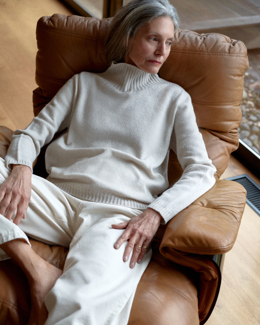 Nineties ease. Made new. A Navygrey silhouette that pays homage to the very first funnel we created. In a mid to lighter-weight gauge, with no shoulder seams or bulky joins, it sits beautifully against the body. Knitted in Scotland with 100% superfine lamb’s wool - using seamless circular technology, it delivers a clean fit with just the right amount of drape. Think early 90s Vogue. This is the kind of knit that slips into your wardrobe with confidence - polished enough for dinner, relaxed enough for Sundays. Modern. Minimal. Endlessly wearable.