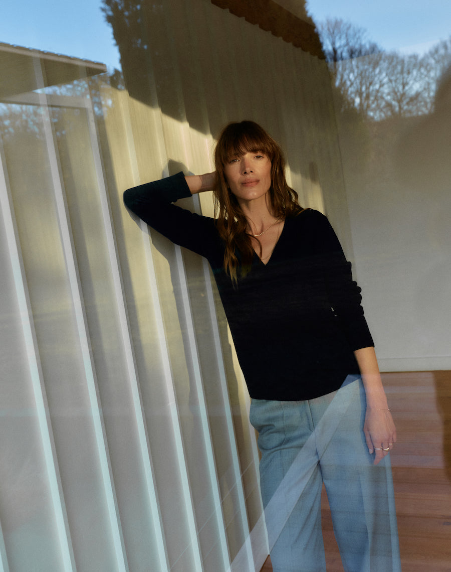 For reference, Rachel wears the Extra-Fine Crew in Graphite in a Small - she's a UK10 and 5"6 in height. Jen wears the Extra-fine Crew in Navy in a size medium and is 5'9.