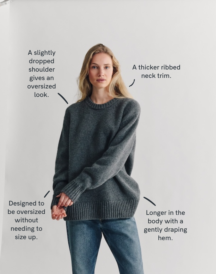 The original. Still the one. First introduced in 2022, the Oversize has become a true Navygrey icon - much loved, much copied, never matched. Knitted here in the UK with our signature Scottish-spun wool, it’s weighty yet wearable - a jumper that holds its shape while moving with you. The longer length, dropped shoulder and our distinct thicker neck trim give it that unmistakable Navygrey ease and structure. Elegant. Effortless. Cocooning. The kind of knit that always feels right - dressed up or down, year after year.