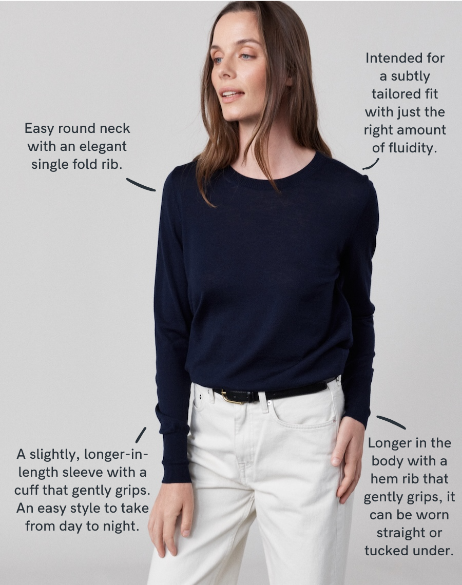 For reference, Rachel wears the Extra-Fine Crew in Graphite in a Small - she's a UK10 and 5"6 in height. Jen wears the Extra-fine Crew in Navy in a size medium and is 5'9.