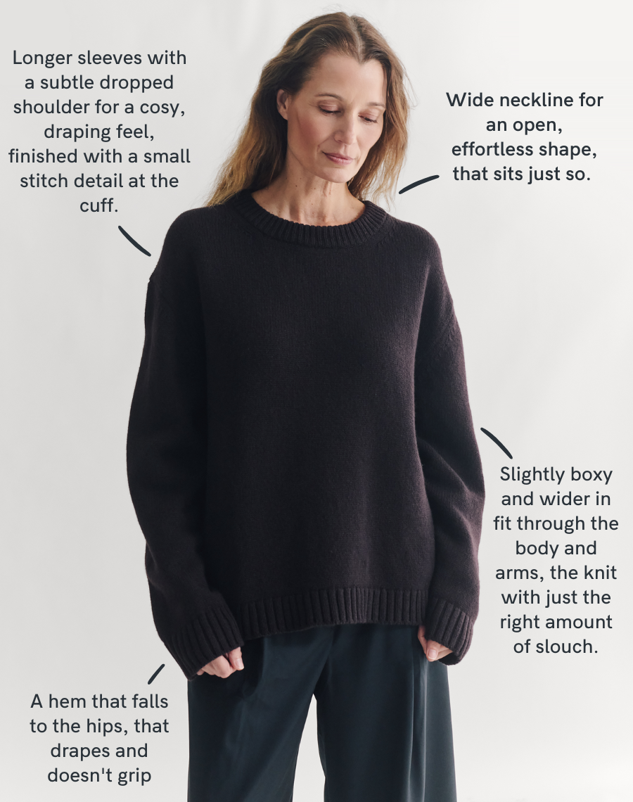 The slouch of the 90s, with the polish of now. Relaxed and feminine - cut for that elusive balance. A silhouette that earns its name. The Drape is the culmination of refinement - built from our core silhouettes, shaped by your real feedback - designed to give you a knit with that balance between effortlessness and fluidity. Soft through the body, fluid in the sleeve - it falls just right.  A shape that moves easily between dressed-down days and dressed-up evenings. Think slouchy denim, a wide leg silk pant.