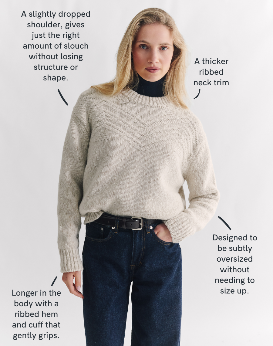This is our softest wool. It's a sweet spot of real softness with substance. Warming and structured, this knit is in a chunkier-weight gauge.