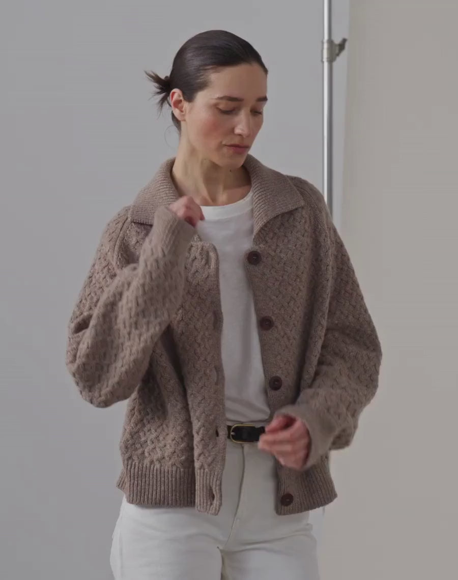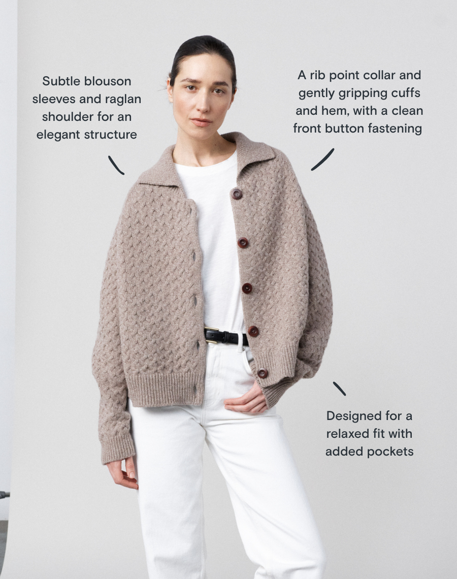 To be despatched w/c 16th March. A jacket, the Navygrey way. Inspired by our much-loved Maree cardigan, this new silhouette is designed to be worn a little more like outerwear - relaxed and easy. Knitted in England from 100% Scottish-spun wool, it carries the same comforting softness you know from our knitwear, with a slightly more substantial feel that works beautifully as a light layer. The shape is gently oversized, with a soft blouson sleeve that gives it an effortless drape - easy to throw on, easy to wear. Finished with British-made corozo-nut buttons and subtle fully-fashioned details. Wear it open over our linen tee with jeans. Add a shirt, blouse or our Weekend Polo underneath for cooler days. An easy layer to throw on as the seasons begin to shift.