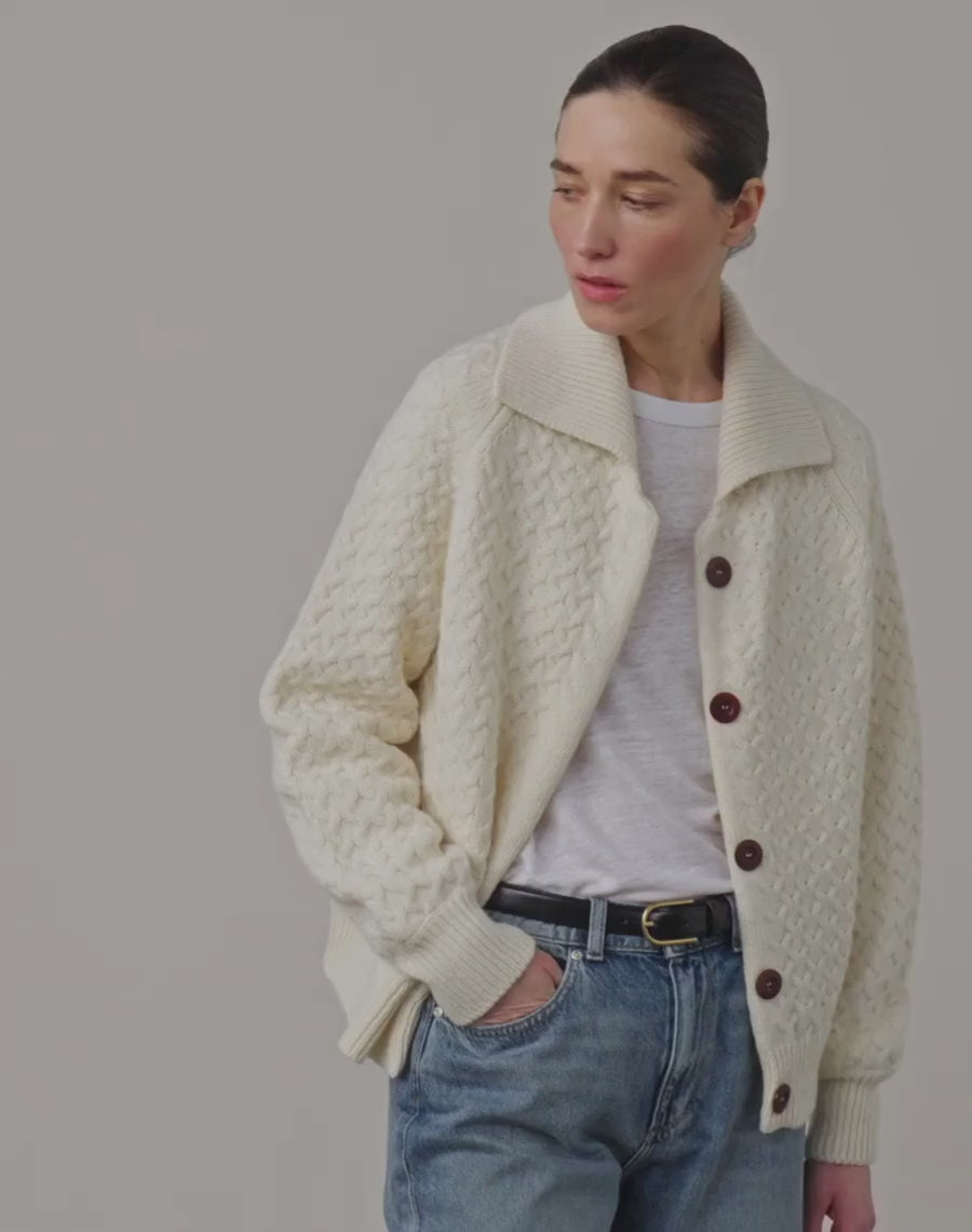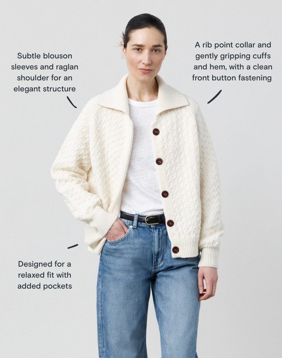 To be despatched w/c 16th March. A jacket, the Navygrey way. Inspired by our much-loved Maree cardigan, this new silhouette is designed to be worn a little more like outerwear - relaxed and easy. Knitted in England from 100% Scottish-spun wool, it carries the same comforting softness you know from our knitwear, with a slightly more substantial feel that works beautifully as a light layer. The shape is gently oversized, with a soft blouson sleeve that gives it an effortless drape - easy to throw on, easy to wear. Finished with British-made corozo-nut buttons and subtle fully-fashioned details. Wear it open over our linen tee with jeans. Add a shirt, blouse or our Weekend Polo underneath for cooler days. An easy layer to throw on as the seasons begin to shift.