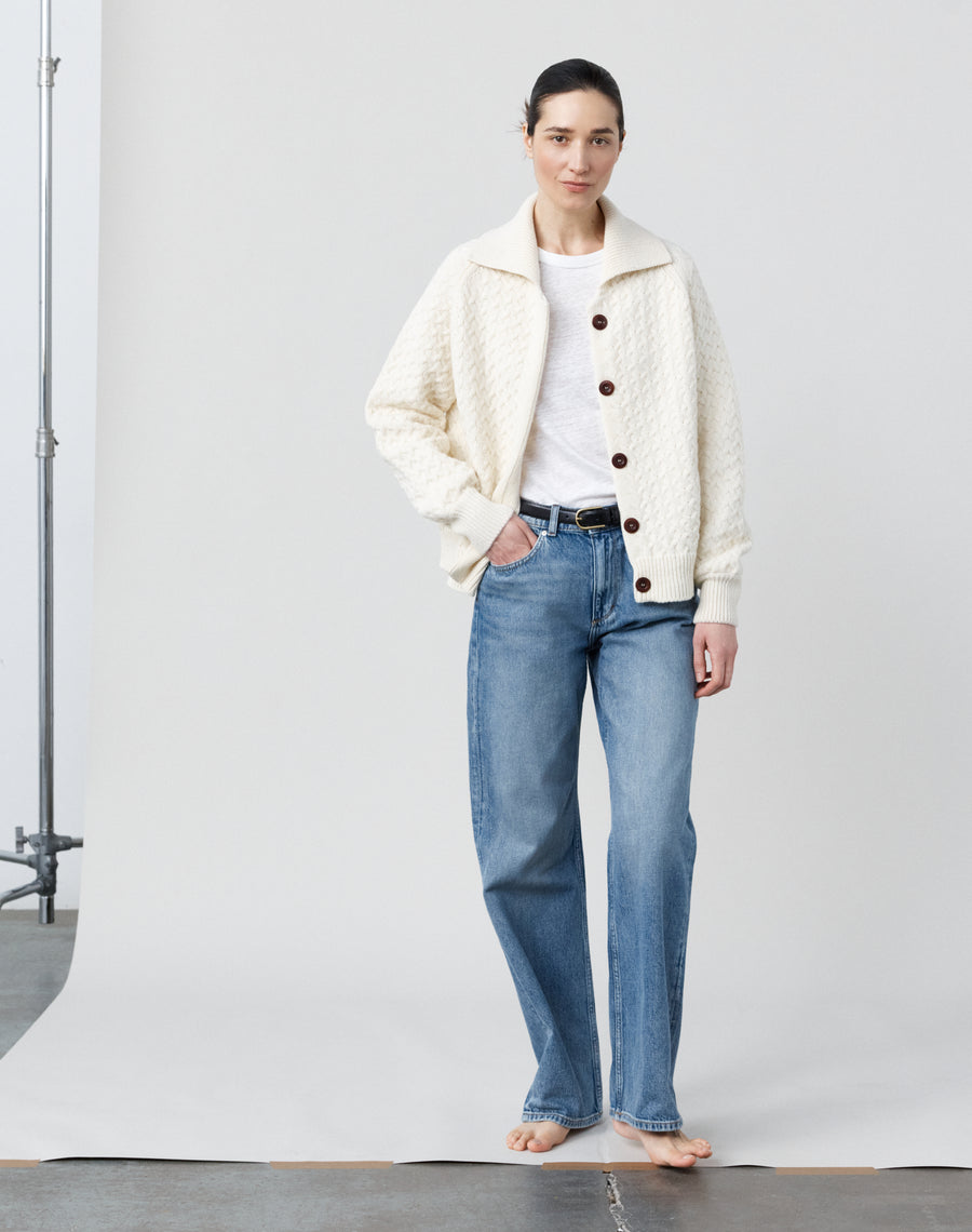 Our 5gg jacket - the same weight as our best-selling Easy Cardigan, with a reverse horseshoe stitch. Warm, but with an easy lightness. Perfect layered over a tee on mild spring days, or under a coat through the colder winter months.