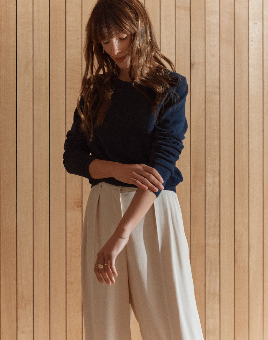 For reference, Rachel wears the Extra-Fine Crew in Graphite in a Small - she's a UK10 and 5"6 in height. Jen wears the Extra-fine Crew in Navy in a size medium and is 5'9.
