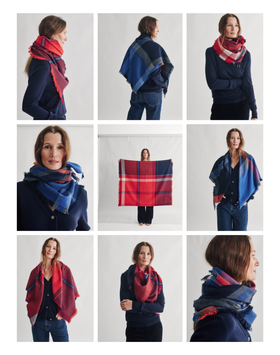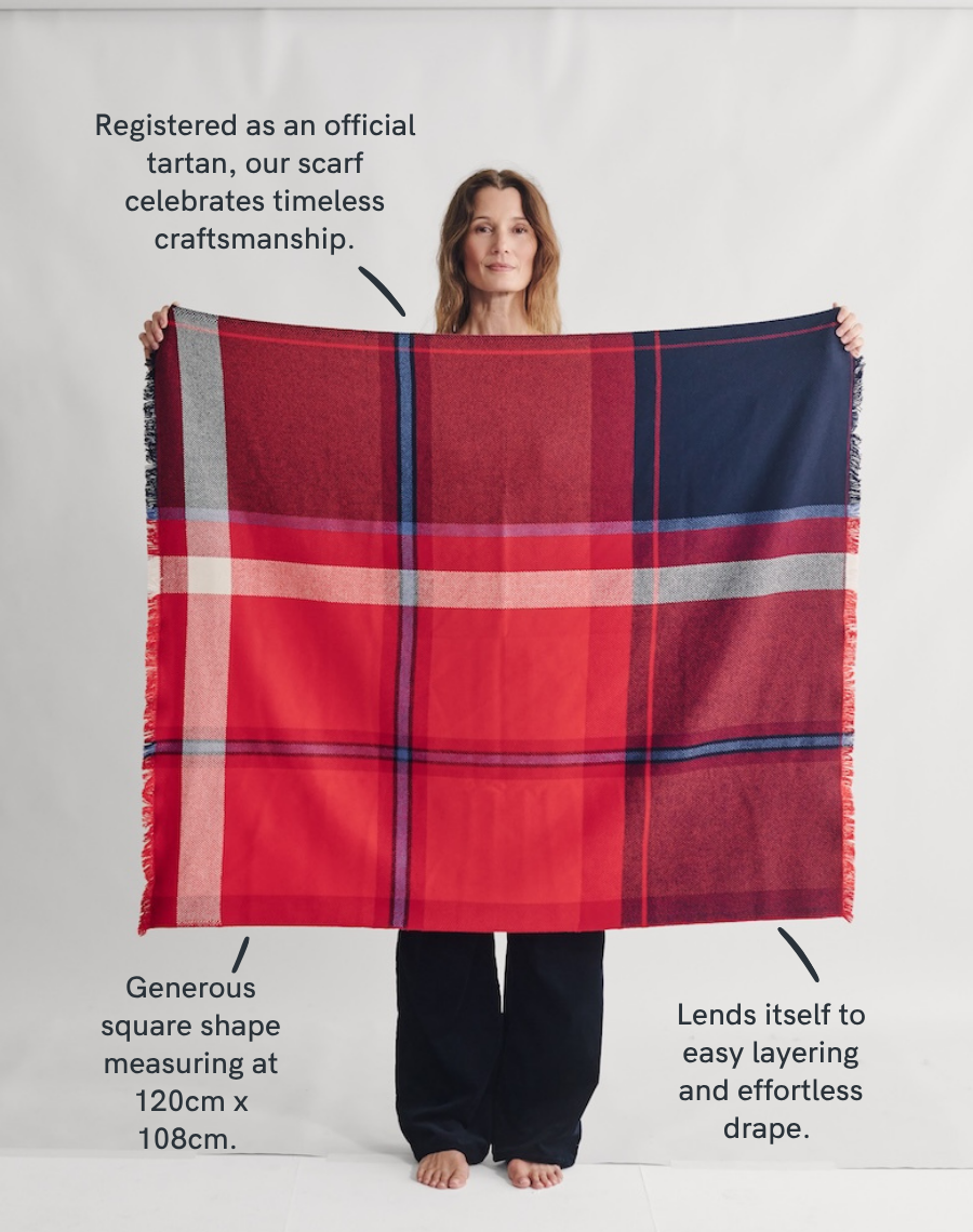 Where heritage meets modern ease. Registered as an official tartan, its generous square shape - 120cm x 108cm - makes it endlessly versatile. Wrap it your way -light, warm and endlessly chic. Drape it over your shoulders, wrap it close, knot it loose - it always falls just right.