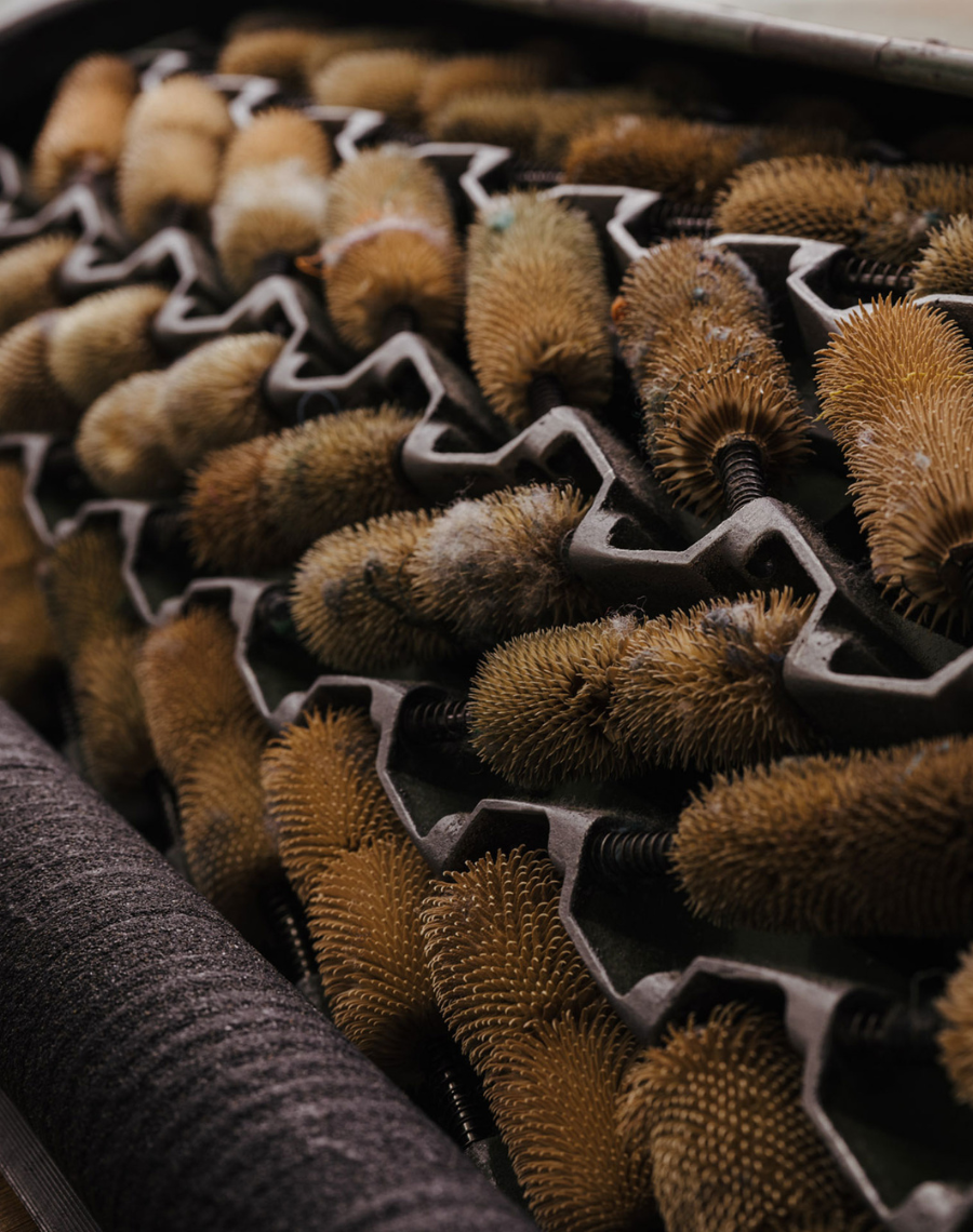 Traditional teasels (Dipsacus Fullonum) lift the surface just enough to reveal a finish that feels both new and true: a little airy, a touch shaggy, always natural. It's a technique that cannot be replicated by any man-made alternative.