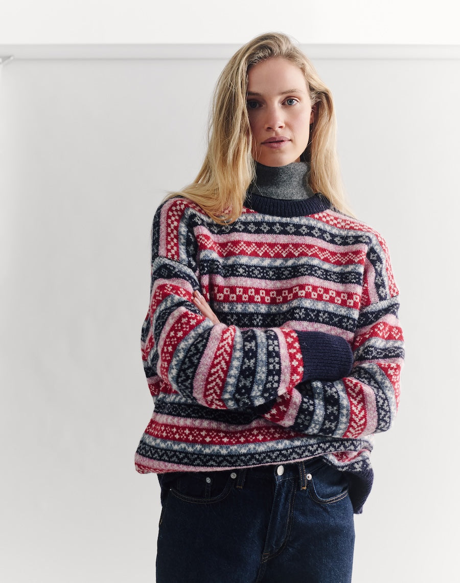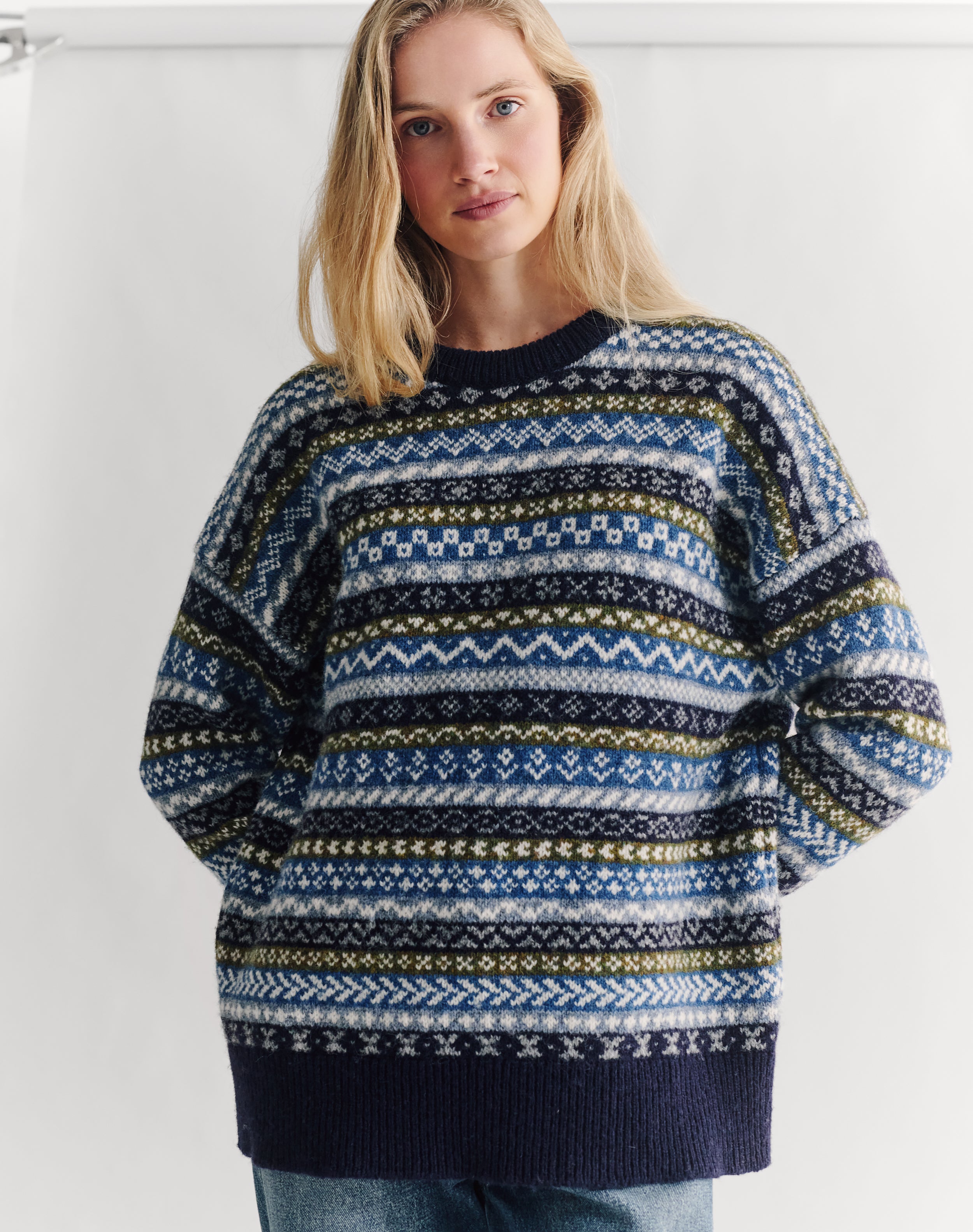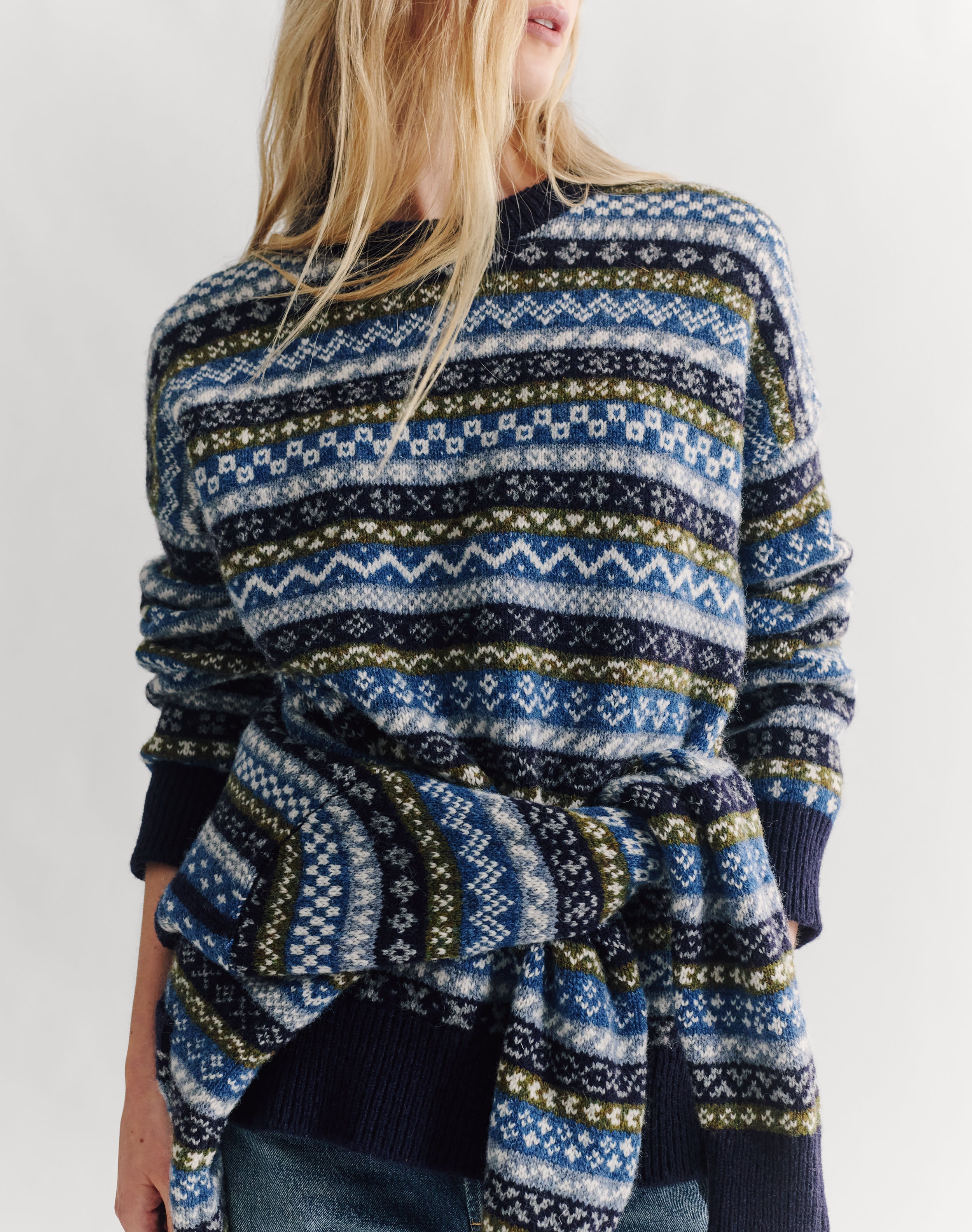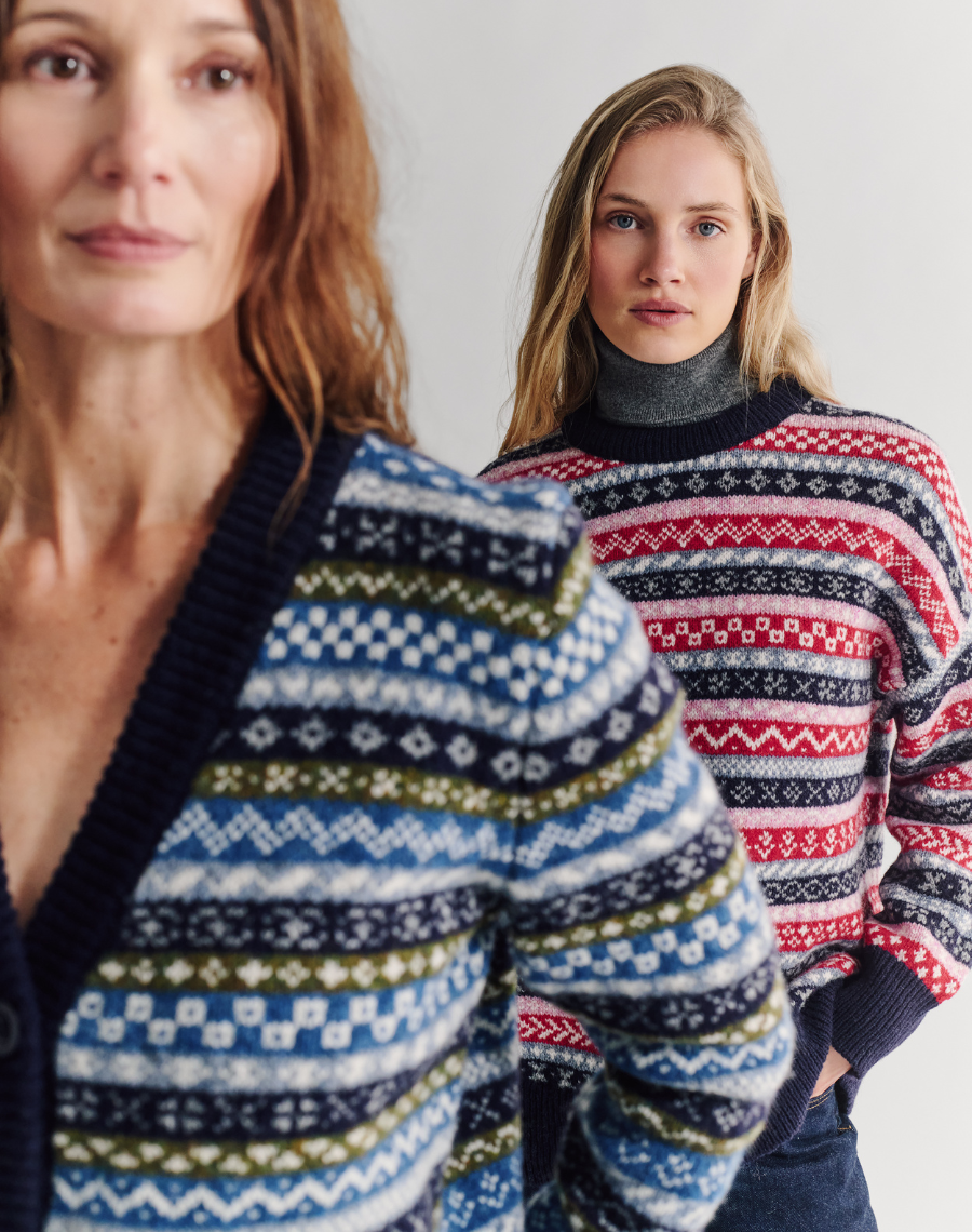 Evocative and magical. Skills passed down through generations. Introducing a true Fair Isle. Made with 100% Shetland Wool, sourced exclusively from Shetland. Designed on the Fair Isle in collaboration with textile designer and Fair Isle resident Marie.