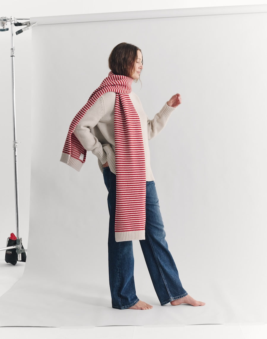 We've combined the much-loved hues of Lait & Carmine together to create a cool striped scarf that pops. A little bit statement, but not too much. Just how we like it. Super soft, with extra length for wrapping up and wrapping around. Made in the British Isles from our signature soft, 100% Scottish-spun Lambswool, made for cool weekend walks.