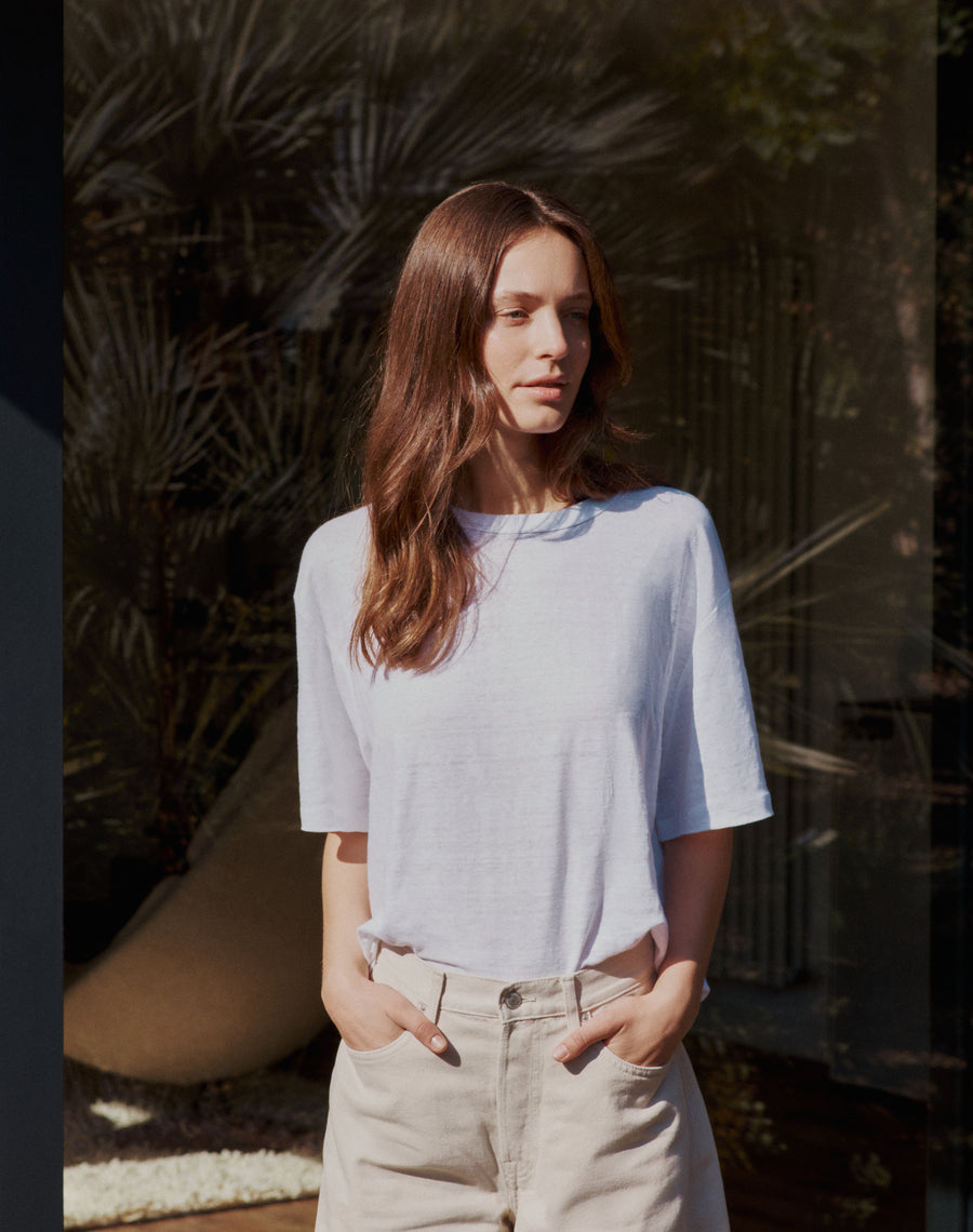 Crafted from 100% European Flax that is soft, and with just the right amount of slouch. Finished with an organic cotton neck trim adding a structured polish, so it sits just right on the neck.