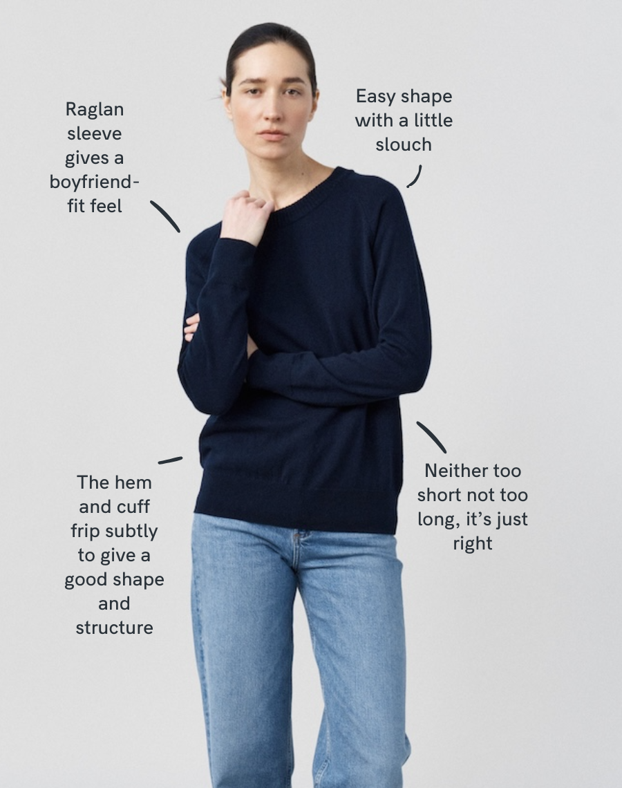 A raglan sleeve silhouette, that fits true to size with an elegant double ribbed neckline. Based on the classic fit of a man’s jumper but tweaked for the Navygrey woman.