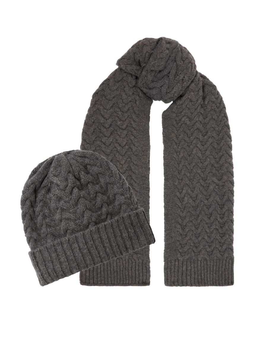 A cosy beanie style hat, with just the right amount of slouch and a fold-back rib detail, and a longer-in-length scarf. Both pieces are knitted in our signature horseshoe cable.