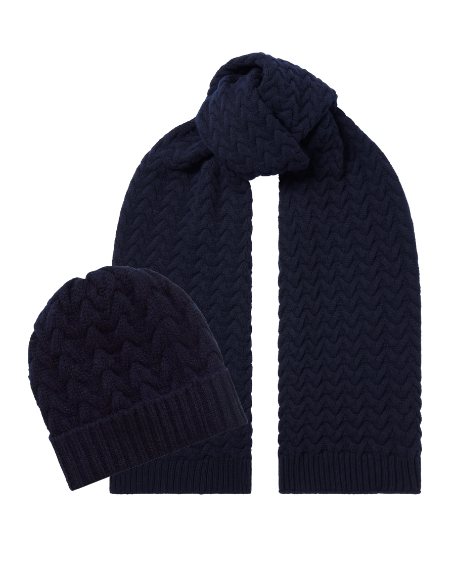 A cosy beanie style hat, with just the right amount of slouch and a fold-back rib detail, and a longer-in-length scarf. Both pieces are knitted in our signature horseshoe cable.