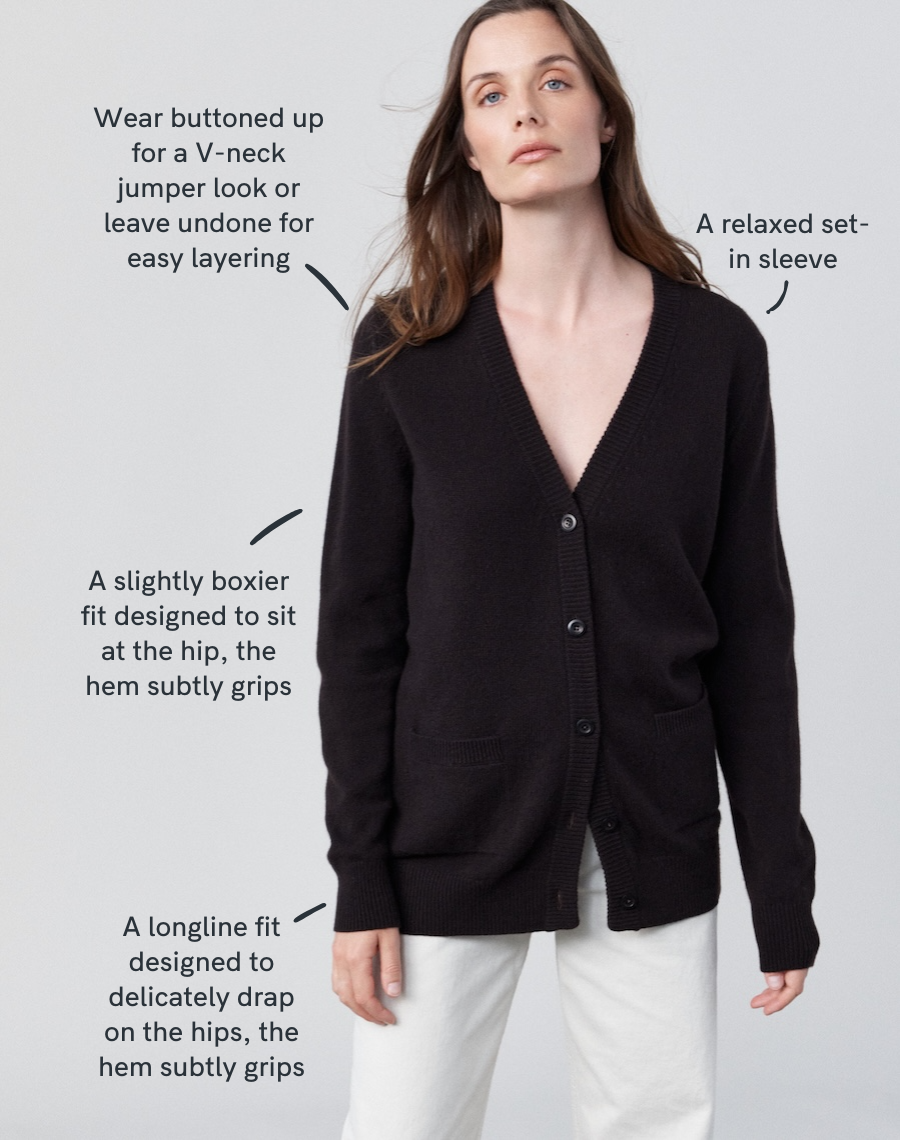 A classic subtly oversized longer in length Cardigan. With a v-neck fine ribbed placket. Wear buttoned-up or undone. This is the longer version of our original CARDIGAN.