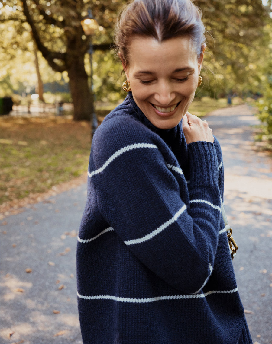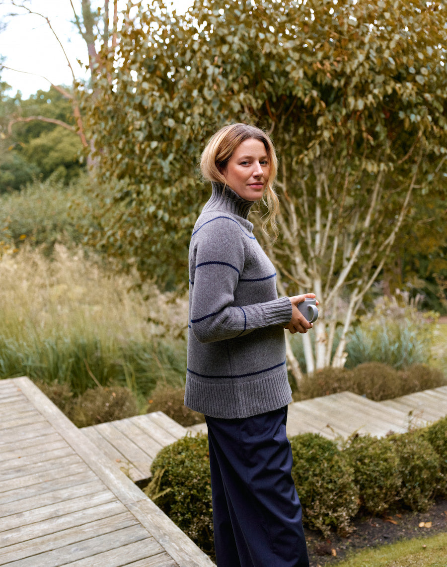 A funnel neck that can be up or rolled down (and inwards) for a more crew-like effect. The tactile softness of the Scottish-spun wool.