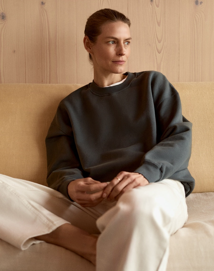 Knitted, dyed, made, and finished within a 46-mile radius in Portugal. Unbelievably, it can take more than 8,000 miles of travel to make a single sweatshirt.