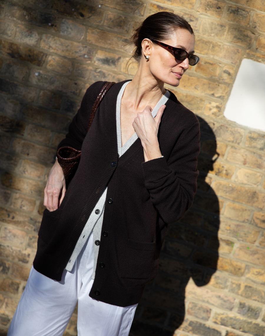 A classic subtly oversized longer in length Cardigan. With a v-neck fine ribbed placket. Wear buttoned-up or undone. This is the longer version of our original CARDIGAN.