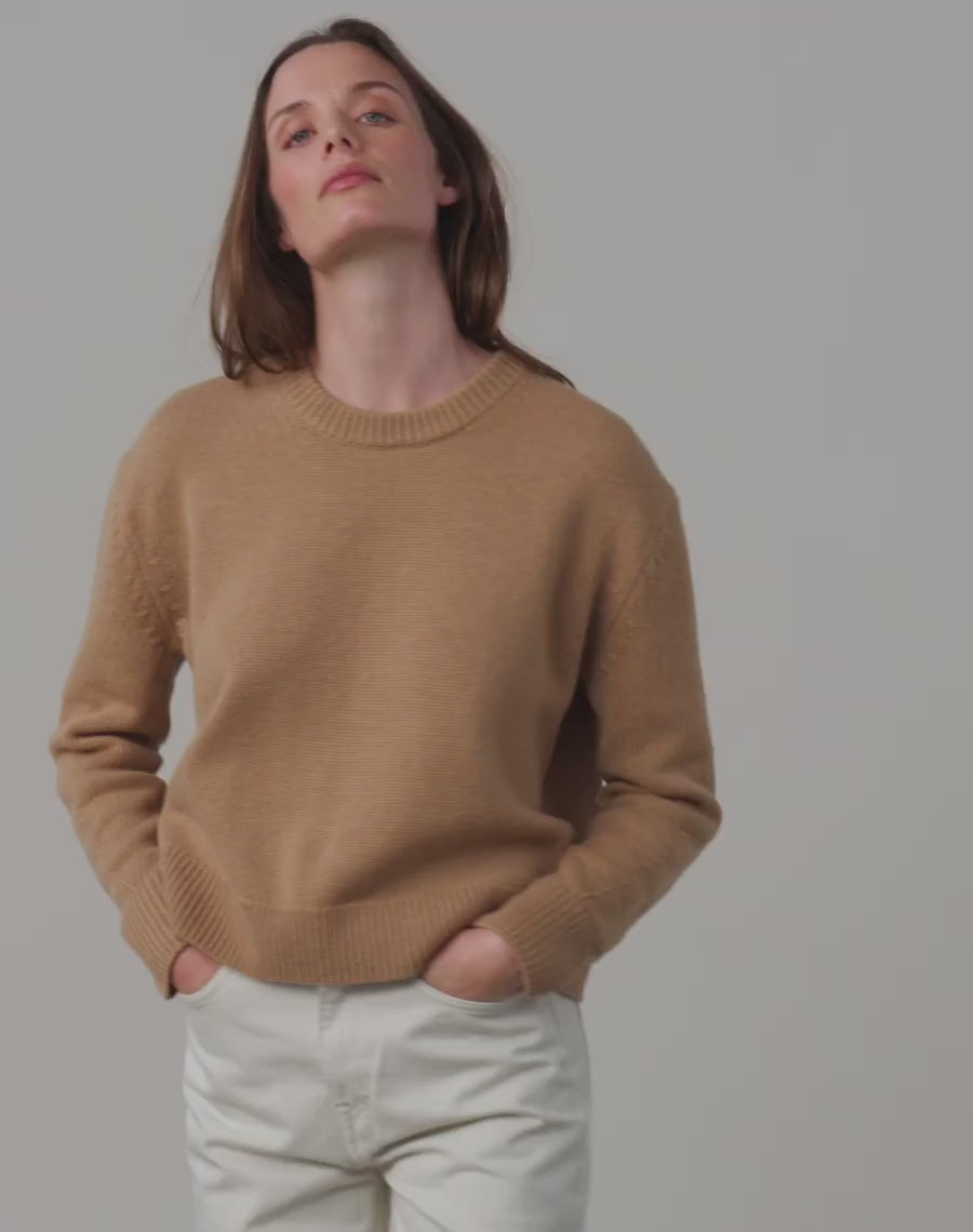 This is our softest wool. It's a sweet spot of real softness with substance. Warming yet light as this knit is in a mid-weight gauge. It's the purity of the Scottish water used throughout the spinning process that makes this wool feel so smooth and soft.