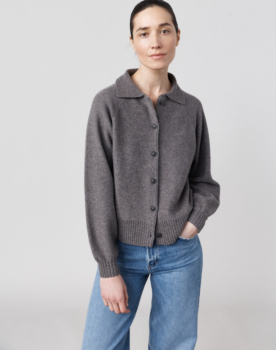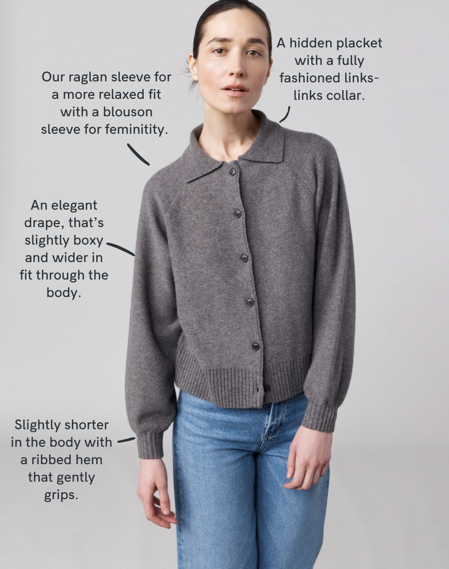 A feminine cardigan with raglan blouson sleeves and a clean, understated silhouette. Finished with a purl reverse jersey stitch for added texture, it features a fully fashioned links-links collar, a neat button-through placket, and a shorter, boxier length that sits effortlessly balanced on the body.