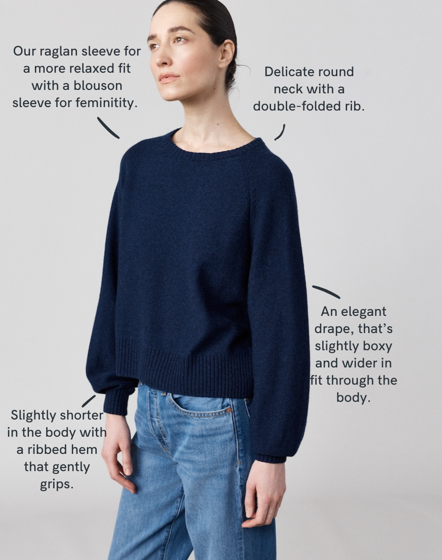 Drawing on the ease of our Relaxed and Easy shapes, with the considered raglan sleeve of our much-loved Weekend crew. A softer structure - more fluid, more feminine - grounded in everything we believe good knitwear should be. Our signature Scottish-spun wool, knitted using the reverse of the jersey stitch - the purl side facing out - for a finish that’s subtle, soft and tactile. A sleeve with the slightest blouson. A neat neckline. A hem that drapes. A year-round, mid-weight layer - the one you reach for as the season shifts. Modern. Feminine.
