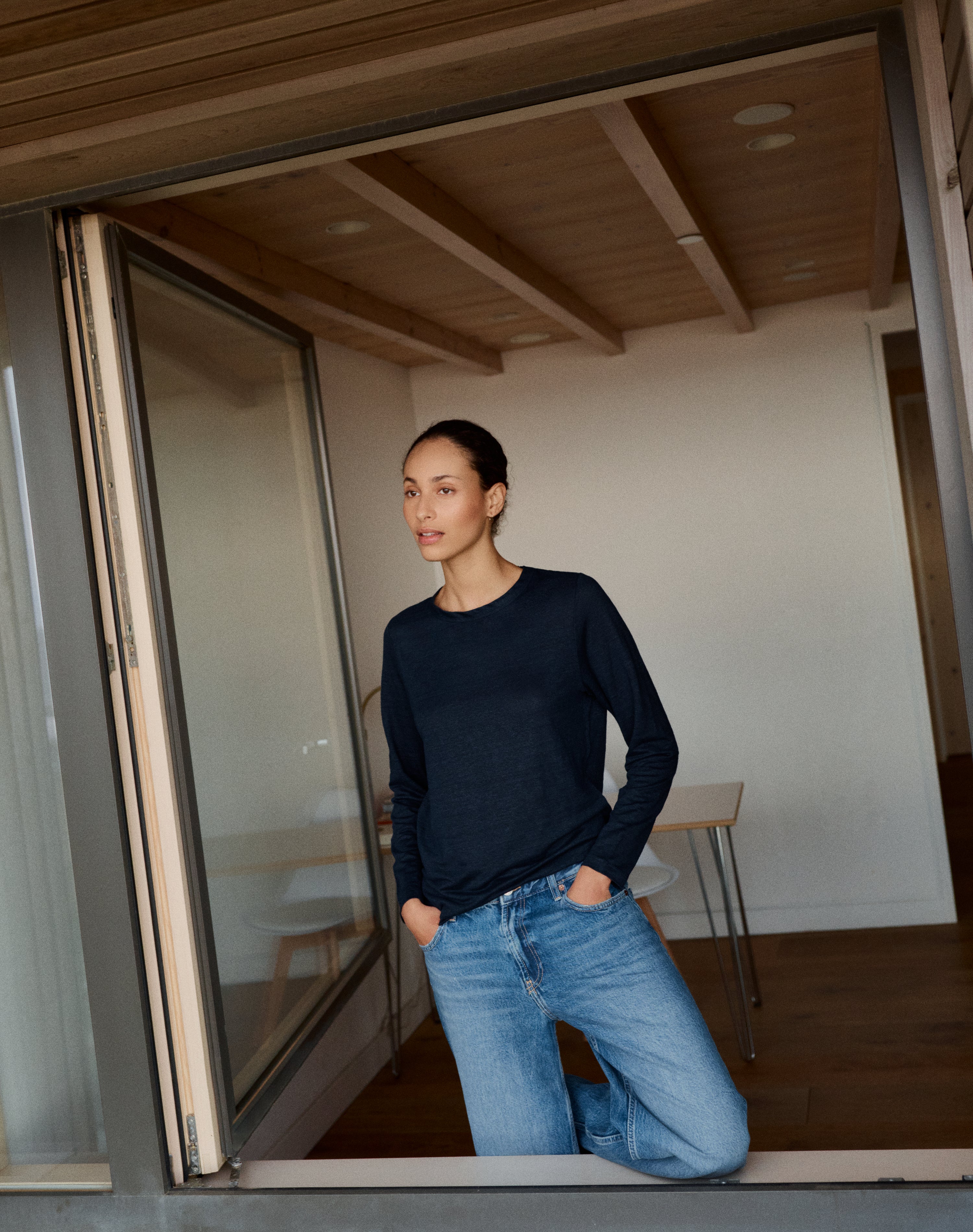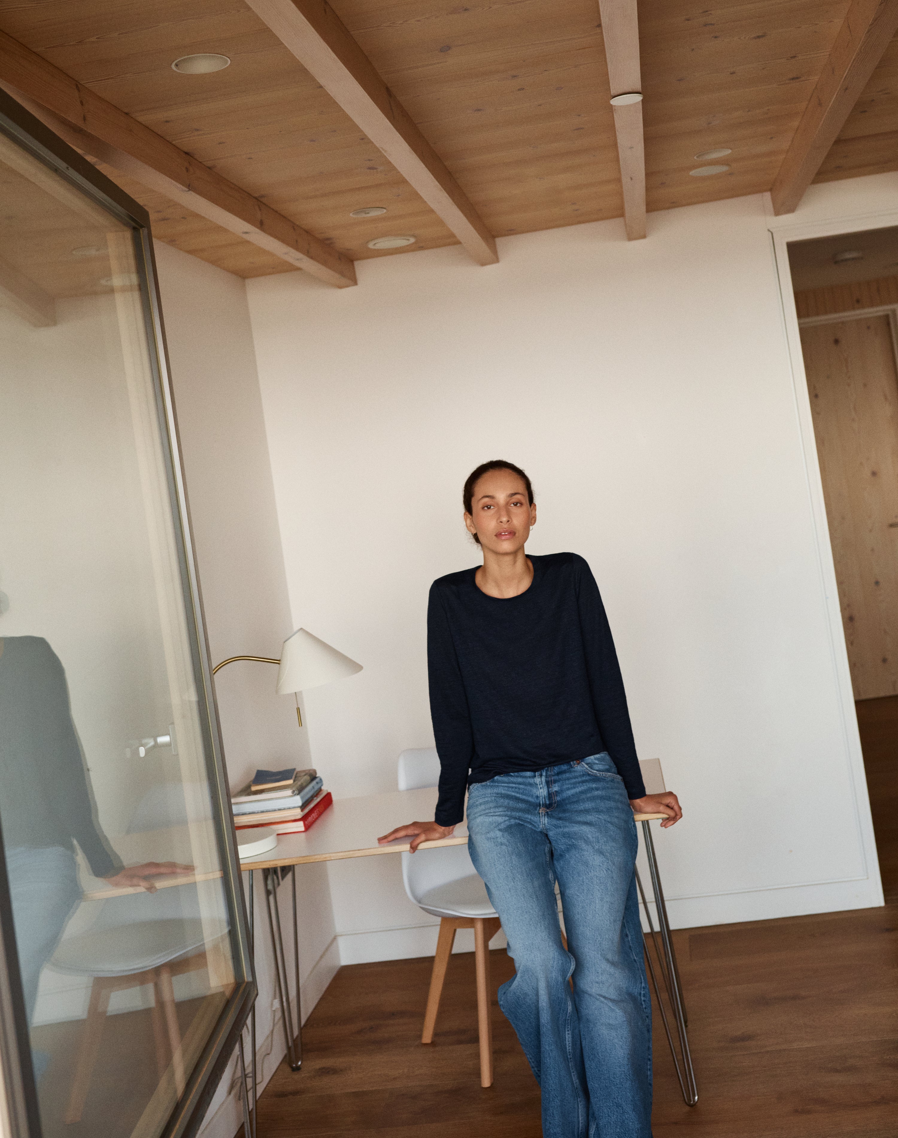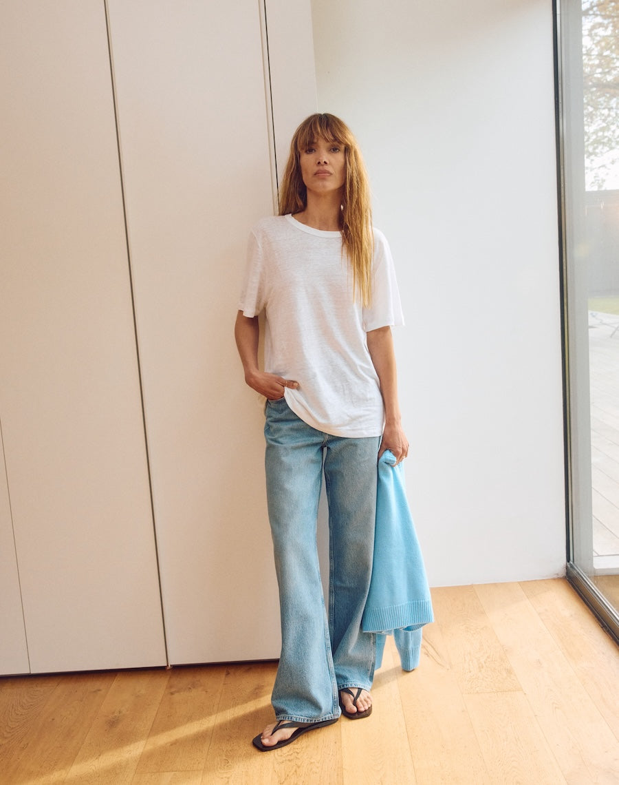 Spun from the finest flax sourced exclusively from certified fields within Europe, this style brings a boxier, more relaxed silhouette. Wider through the body, with a sleeve that falls just so - longer, soft and easy. The drape is fluid yet grounded. At the neck, a ribbed trim in contrasting organic cotton adds structure - uncomplicated, understated, but with a knowing detail. Because a good neckline means everything when it comes to a hardworking t-shirt. To be worn alone or easily layered under your favourite knit.