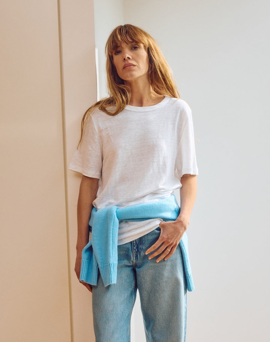 Crafted from 100% European Flax that is soft, and with just the right amount of slouch. Finished with an organic cotton neck trim adding a structured polish, so it sits just right on the neck.