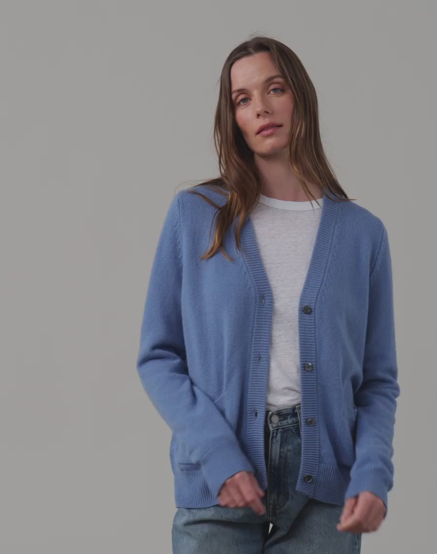 A classic subtly oversized Cardigan. With a v-neck fine ribbed placket. Wear buttoned-up or undone.