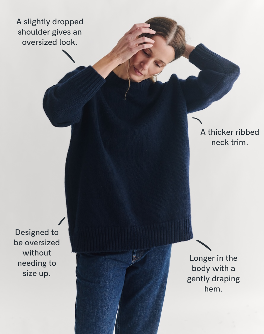 Back in stock. The original. Still the one. First introduced in 2022, The Oversize has become a true Navygrey icon - much loved, much copied, never matched. Knitted here in the UK with our signature Scottish-spun wool, it’s weighty yet wearable - a jumper that holds its shape while moving with you. The longer length, dropped shoulder and our distinct thicker neck trim give it that unmistakable Navygrey ease and structure. Elegant. Effortless. Cocooning. The kind of knit that always feels right - dressed up or down, year after year.