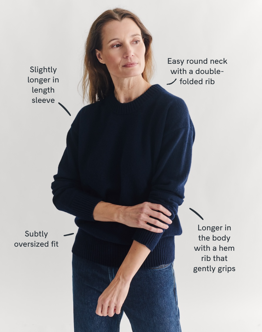For reference, Rachel wears the RELAXED in Lapis in a Small - she's a UK10 and 5'6 in height. Jen wears the RELAXED V in Navy in a size small and is 5'9. Holly wears the RELAXED V in Carmine in a Size Small and is a UK08 and 5'10 in height.