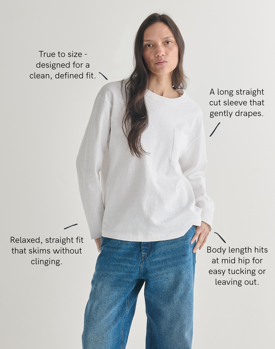 A true-to-size, structured organic cotton top. A straight fit, that's neither too fitted nor too slouchy.